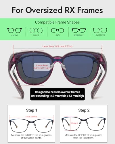 - Over the Glasses Sunglasses|Specially designed frame structure for lens stacking. Inner height 54mm × width length 145mm, compatible with 90% RX and reading frames (recommended width <145mm). Classic oversized shape with decorative temples, stylish when worn alone.