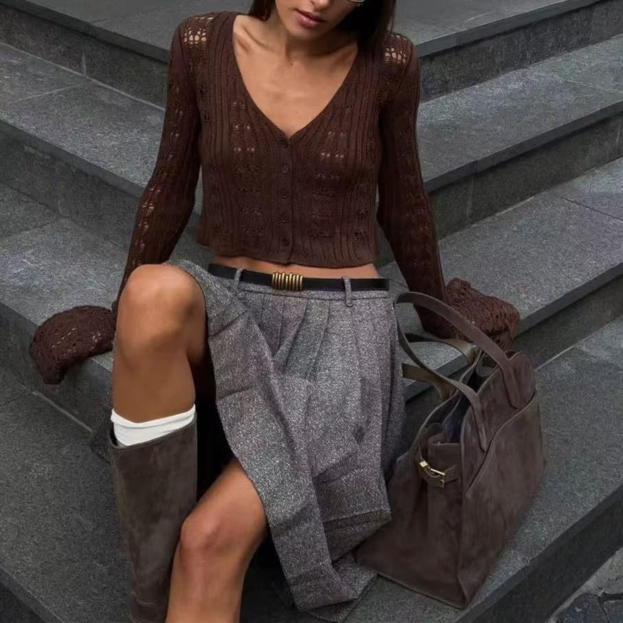 Women Crochet Cardigan Button Down Bell Long Sleeve V Neck Knit Crop Shirts Lightweight Sweater Tops