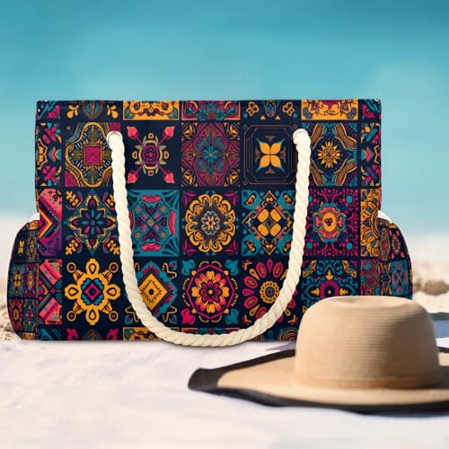 Vintage Mexican Talavera Floral Beach Bag for Women Ladies Large Beach Pool Tote Bag Sandproof Beach Tote with Zipper Gym Tote Carry On Bag Reusable Grocery Shopping Bag for Weekender Travel Daily